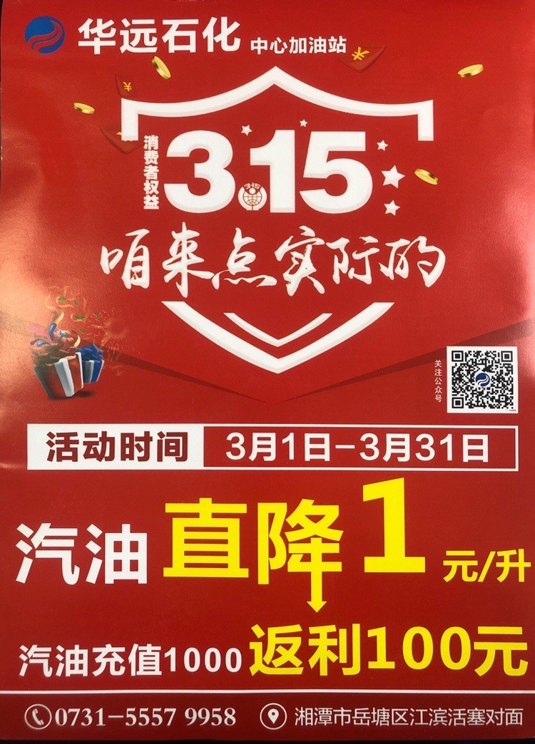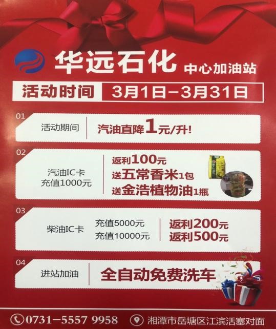 2020年3月疫情得到控制以后,湖南華遠(yuǎn)石化有限公司響應(yīng)政府號召,支持湘潭市各企業(yè)開展復(fù)工復(fù)產(chǎn)工作,在湘潭市中心加油站率先推出油品單價(jià)掛牌價(jià)直降1元的優(yōu)惠活動(dòng),讓利社會,回報(bào)大眾。另外持華遠(yuǎn)石化加油卡充值優(yōu)惠返利10%,活動(dòng)時(shí)間3月份,長達(dá)一個(gè)月,此外充值還贈(zèng)送東北五常大米,金浩茶油等基本生活物資。