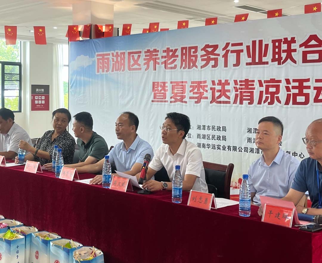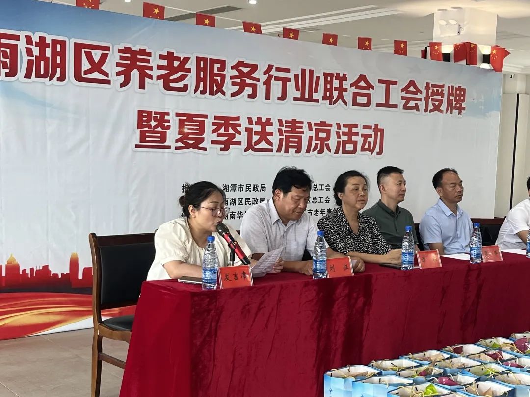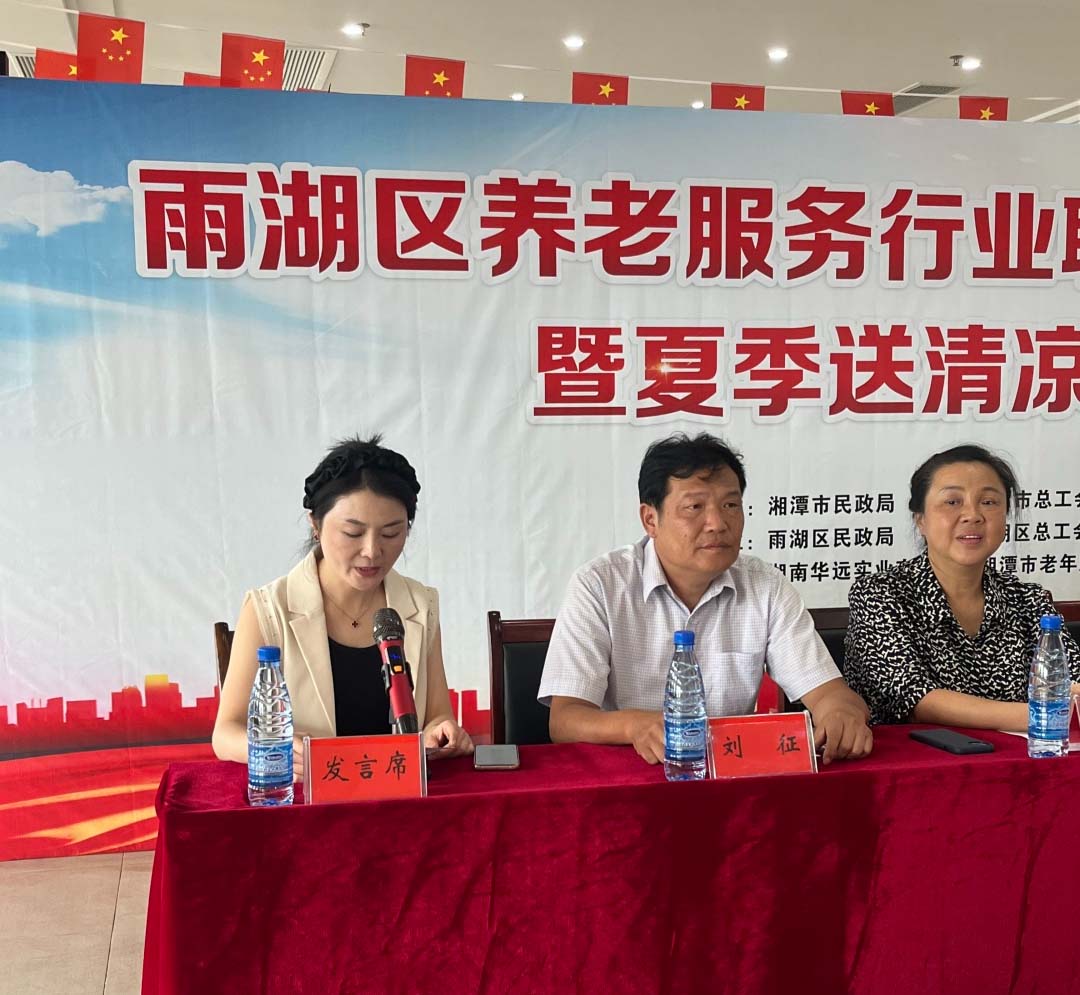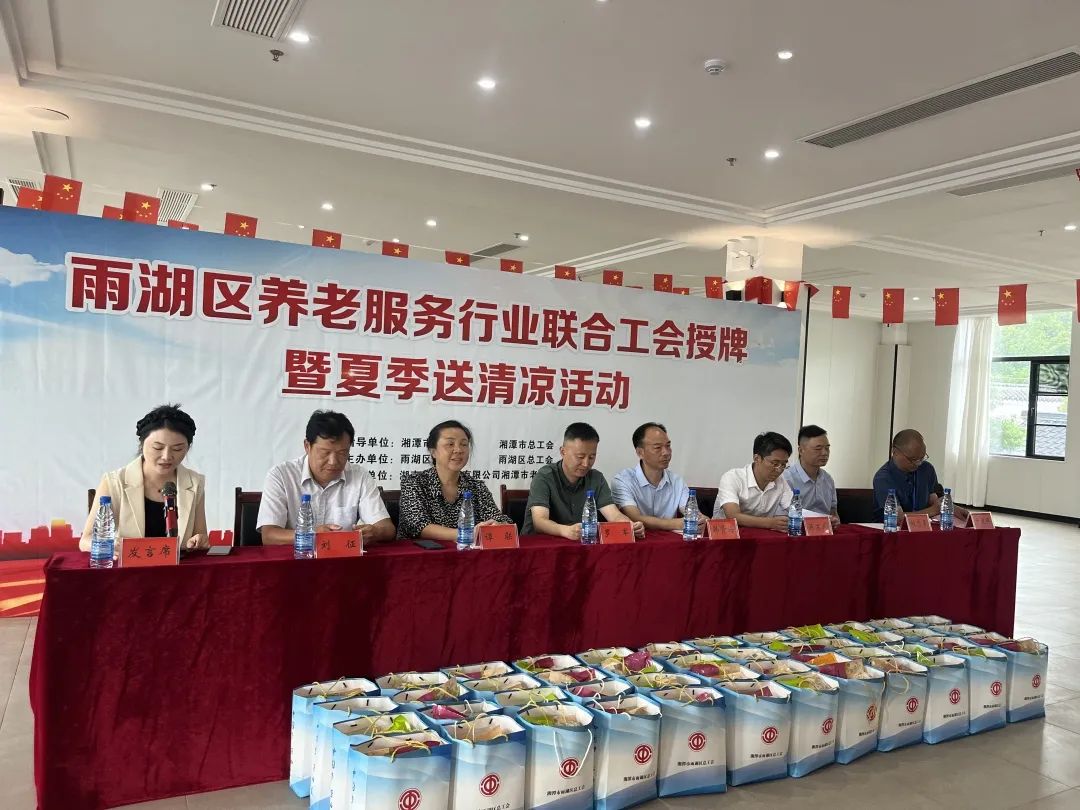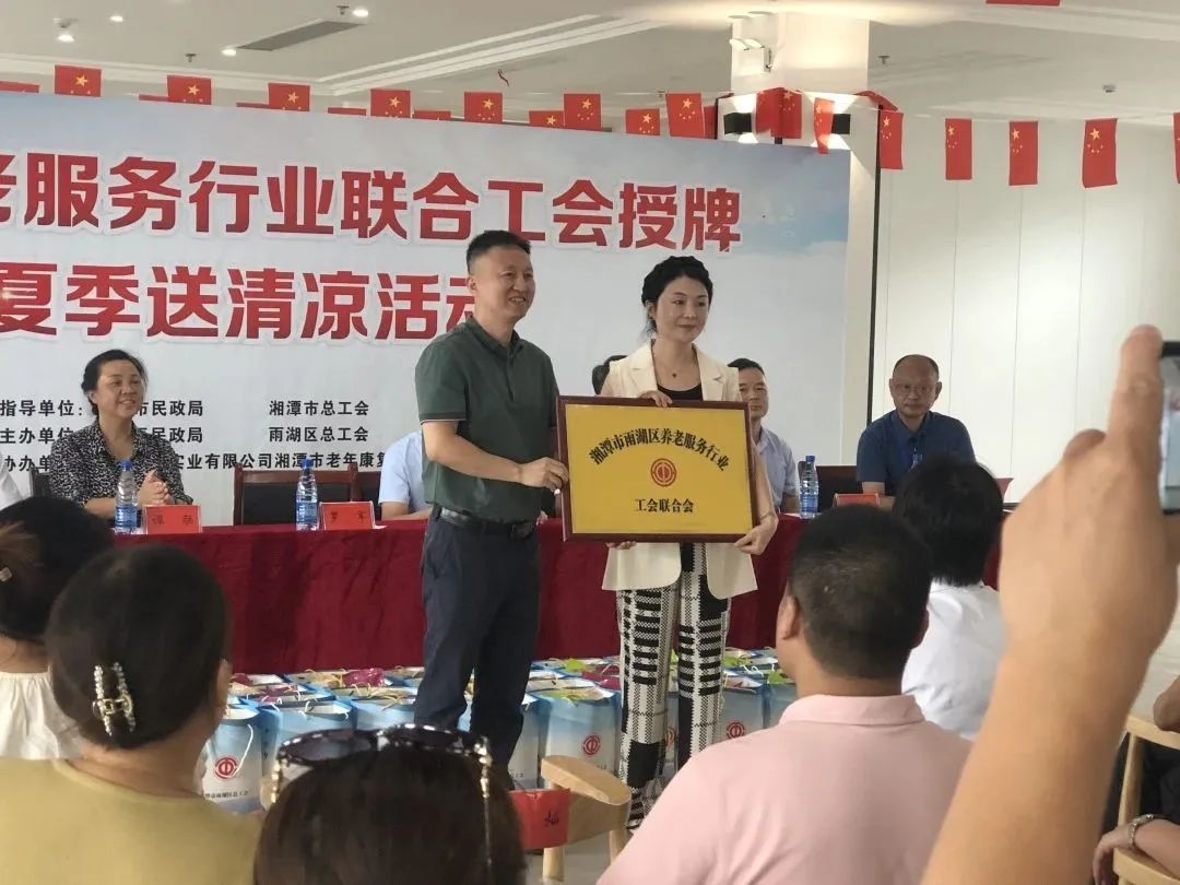 8月23日,雨湖區(qū)養(yǎng)老服務行業(yè)聯(lián)合工會授牌儀式暨夏季送清涼活動在我院舉行。區(qū)總工會黨組書記、常務副主席劉征,人大常委會副主任、區(qū)總工會主席譚聯(lián),市總工會黨組成員、副主席羅軍,湘潭市民政局黨委委員、副局長韓賢海,雨湖區(qū)委副書記蔣文武,市工會組織部部長劉志勇,以及來自雨湖區(qū)各養(yǎng)老機構的負責人代表參會,雨湖區(qū)民政局黨組書記、局長干建暉主持會議,華遠康養(yǎng)中心法人譚燦任首屆工會主席。